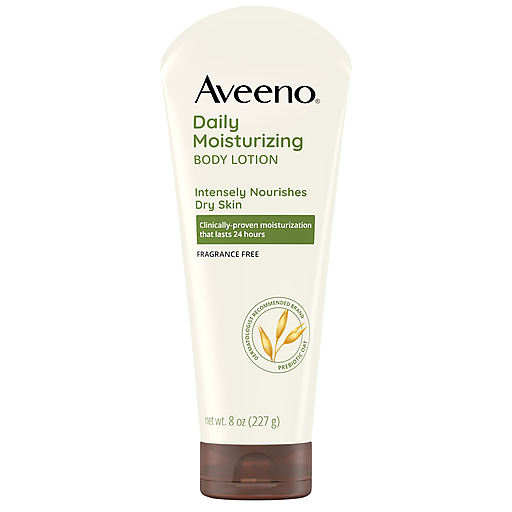 Aveeno Daily Moisturizing Body Lotion with Prebiotic Oat formula intensely nourishes dry skin. Formulated with a soothing prebiotic oat, the fragrance-free lotion has clinically proven moisturization that lasts 72 hours*. This daily body lotion nourishes and helps replenish skin's natural moisture barrier. The unique prebiotic oat formula absorbs quickly and nourishes dry skin with moisture, leaving your skin soft, beautiful and healthy-looking. Aveeno Daily Moisturizing Lotion's gentle formula does not contain fragrances, parabens, or dyes. From the dermatologist-recommended brand, this nourishing lotion for dry skin has been allergy tested and non-greasy, non-comedogenic, and gentle enough for daily use as part of a regular skincare and beauty routine. To use, apply daily as often as needed. "Assessment of moisturization after 72 hours in a clinical study" (Kenvue, 2024)