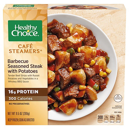 Enjoy satisfying and quick meals with Healthy Choice Cafe Steamers Barbecue Seasoned Steak With Potatoes. Healthy Choice Café Steamers offer healthy frozen meals that give your body everything it needs to feel satisfied. This frozen meal combines tender frozen steak strips with russet potatoes and vegetables in a whiskey BBQ sauce for a dish that is as delicious as it is healthy. A tasty experience any day of the week, this frozen meal is made with no preservatives to deliver wholesome microwave meals that don’t sacrifice flavor. Healthy Choice Cafe Steamers Barbecue Seasoned Steak With Potatoes is perfect for quick and delicious healthy frozen meals at work or frozen dinners at home after a long day. Simply microwave this steak dinner bowl for 4 to 4 1/2 minutes, stir the steamed food into the sauce bowl, and then check to make sure the food is cooked thoroughly before enjoying. Keep this 9.5 ounce Healthy Choice Cafe Steamers Barbecue Seasoned Steak With Potatoes meal in your freezer to have wholesome, healthy meals on hand. Healthy Choice never compromises on ingredients so you can taste the goodness in every bite.