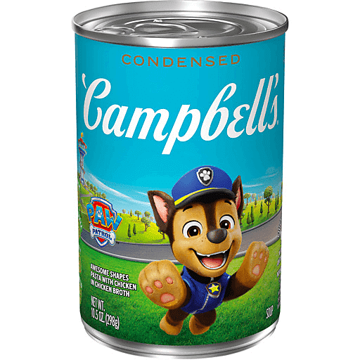 Make mealtime fun with a bowl of Campbell’s® Condensed Kids Soup, Paw Patrol® Awesome Shapes Pasta With Chicken in Chicken Broth. This delightful chicken soup is crafted with savory chicken broth, tender chicken meat with no antibiotics, and Paw Patrol®-themed pasta shapes – including Chase, Skye, Marshall and their shields. The result is a fun, kid-friendly alternative to traditional chicken noodle soup. Top this playful kids soup with Pepperidge Farm® Goldfish® Crackers, or pair it with a sandwich for something quick and easy. Our convenient canned soup is a year-round pantry staple and the perfect comfort food on a chilly day or when your kiddo’s feeling under the weather. Simply mix the condensed soup with 1 can of water and microwave on high for 2.5 to 3 minutes in a covered microwave-safe bowl, or heat in a pot on the stove, stirring occasionally. Each 10.5 oz recyclable can contains about 2.5 servings of microwave soup and features a non-BPA lining. In addition to Paw Patrol®, Campbell’s® soup is available with other character-themed shapes, including Disney® Frozen and Disney® Princess. Campbell’s® makes delicious soups in flavors your family knows and loves, with quality, farm-grown ingredients in every can. M’m! M’m! Good!®