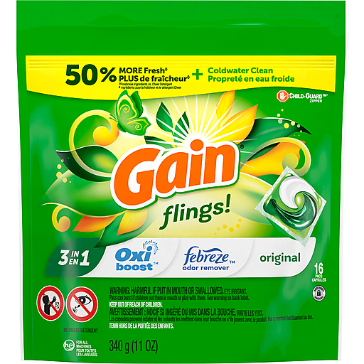 Gain Flings Liquid Washing Detergent pacs deliver an extraordinary clean with a burst of freshness to your laundry routine. With this powerful 4-in-1 washing detergent formula that features 2X* Oxi, up to All Day Scent, Febreze Odor Defense, and Color Guard, your clothes come out fresh and clean every time. These innovative washing pacs are designed to fight frustrating odors, so you can Fight the Funk with freshness using our Febreze Odor Defense technology. With color guard, your clothes will stay bright and vibrant. For up to all day scent, with Gain Flings you can Sniff the Difference. Enjoy our iconic Original Scent, a bright and uplifting fragrance that intertwines zesty citrus notes with lush blooming florals, capturing the essence of a sun-drenched garden. Gain Flings work effortlessly in all machines & water conditions, ensuring your laundry detergent is always effective. Always add Flings to empty drum before clothes for best results. Gain Flings detergent pacs offer the convenience and reliability that busy households need while infusing your clothes with clean freshness and a burst of joyful scent. Includes one 16-count bag of Gain Flings Liquid Washing Detergent pacs in Original Scent. (*2x Cleaning Boosters vs. Gain Original Liquid)
