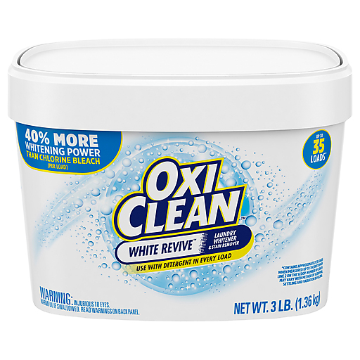 Revive dingy whites and remove tough stains with OxiClean White Revive Laundry Whitener and Stain Remover Powder. This laundry detergent booster whitens whites 40 percent better than chlorine bleach per load without the risk of chlorine spills and splatters. When used as directed, this oxygen-based, water-activated, color-safe stain remover for white & colored laundry removes stains, and brightens and revives machine-washable white clothes, canvas shoes, linen, sheets, t-shirts and more, all without the harsh smell of chlorine bleach. For best results, presoak clothes and shoes in a mixture of this fabric whitener and water following label directions. Ideal for HE and standard washing machines, this whitener for clothes works with your regular laundry detergent as a chlorine bleach alternative to revive brilliant whites–just pour into the drum following label directions. This 3 lb container has enough laundry booster for many loads, so you can wear white fearlessly. From stain removers and laundry boosters to household cleaners and much more, OxiClean offers a product to fit your needs.